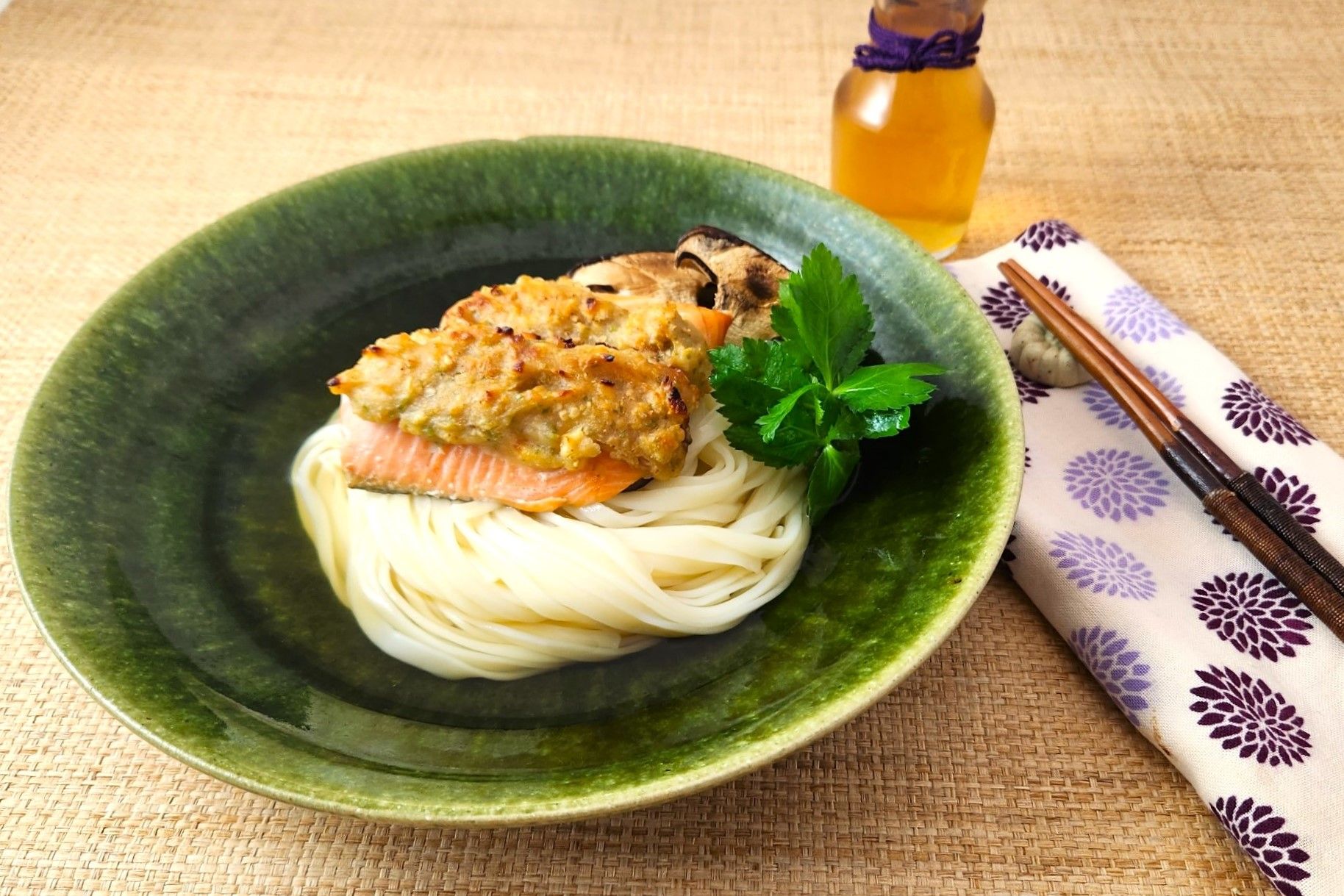 もっちりとした“半生うどん”に、旬の鮭に香りの良い甘味噌を合わせました。味噌をだしに溶かしても美味。温かくしても美味しいですよ。