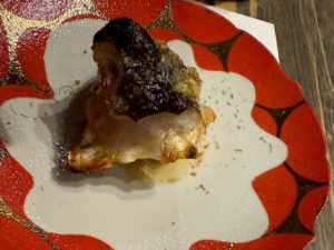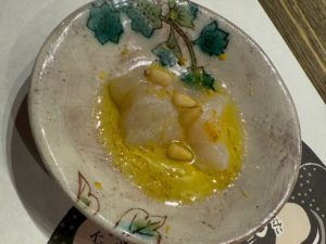3年からすみの炙り、とらふぐピザに続いて、オリーブオイルと大和橘の皮をまとったとらふぐは歯応えのしっかりした食感と橘の香りと苦味がアクセントになり、とても美味でした😋