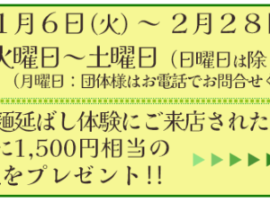 桜井市黒崎の店舗にて実施している【手延べ麺延ばし体験】を お得にご体験いただけるキャンペーンが始まります。 引っぱりたて麺延ばし体験では、工場直送の「ノンオイル麺」を お客様に延ばしていただきます。 引っぱった麺はお土産 … Continue reading